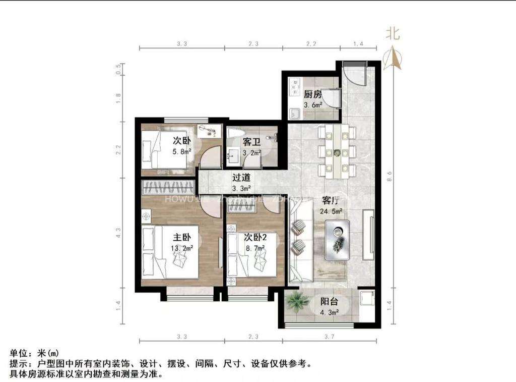厅室3室2厅2卫1阳台