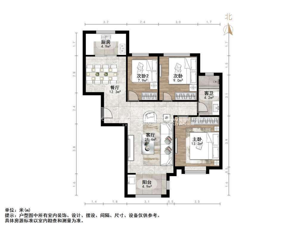 厅室3室2厅1卫1阳台