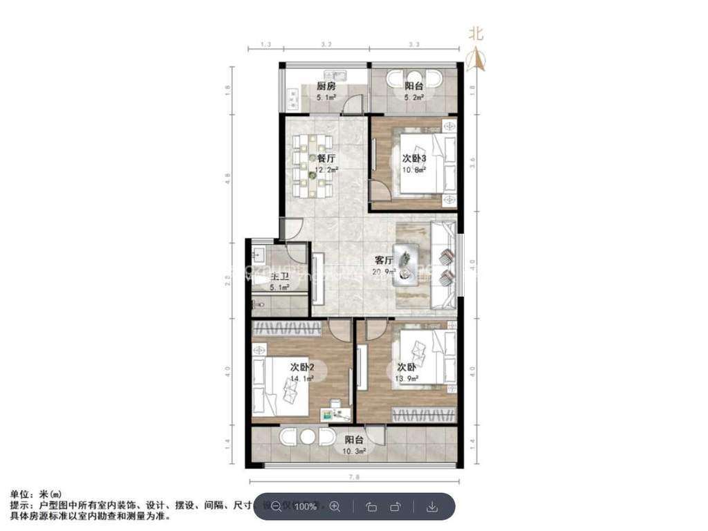厅室3室2厅1卫2阳台