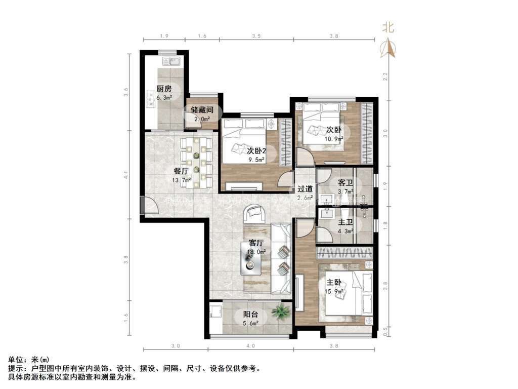 厅室3室2厅2卫1阳台