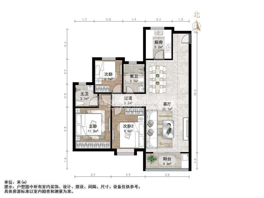 厅室3室2厅2卫1阳台