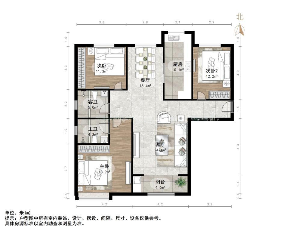 厅室3室2厅2卫1阳台