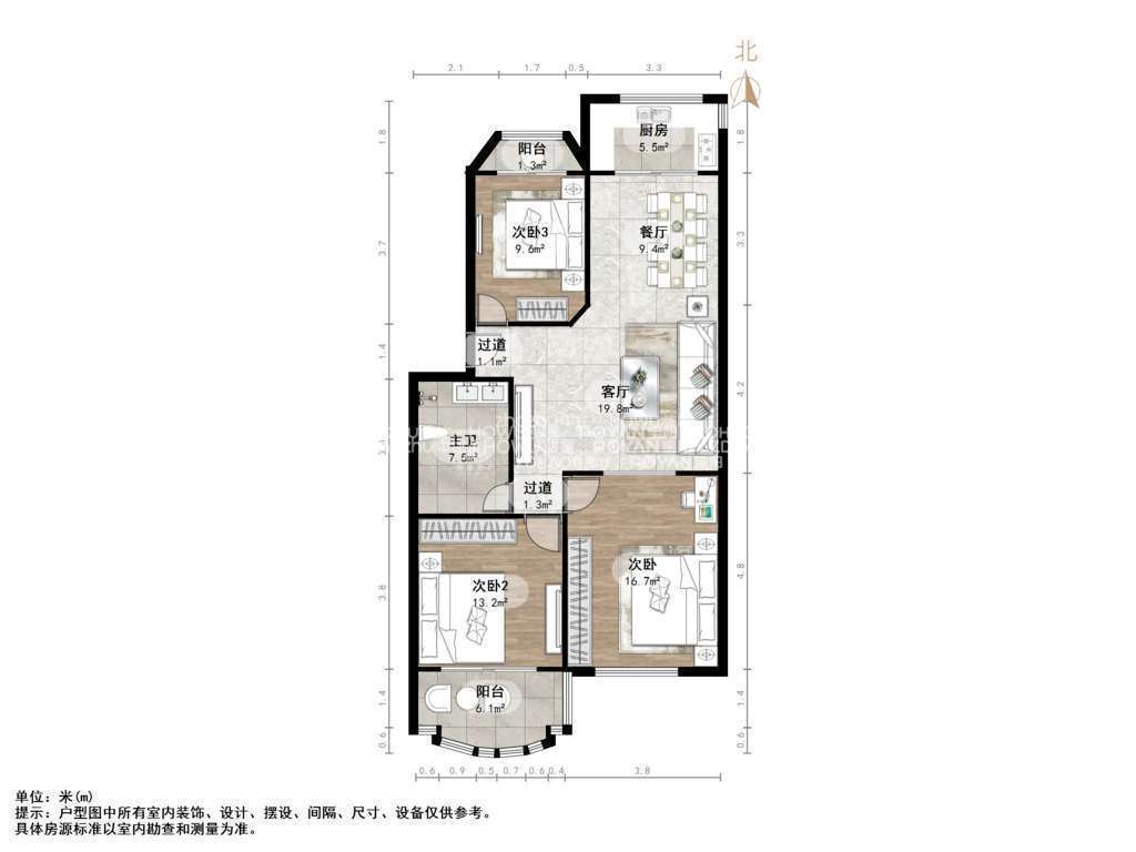 厅室3室2厅2卫1阳台