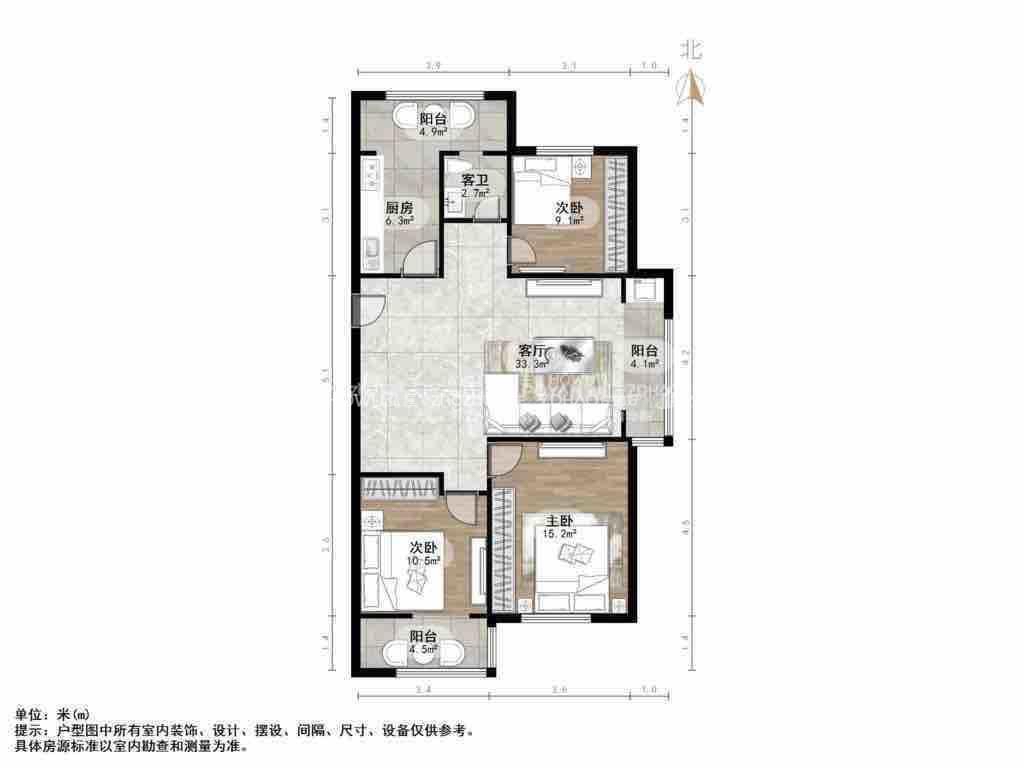 厅室3室2厅1卫1阳台