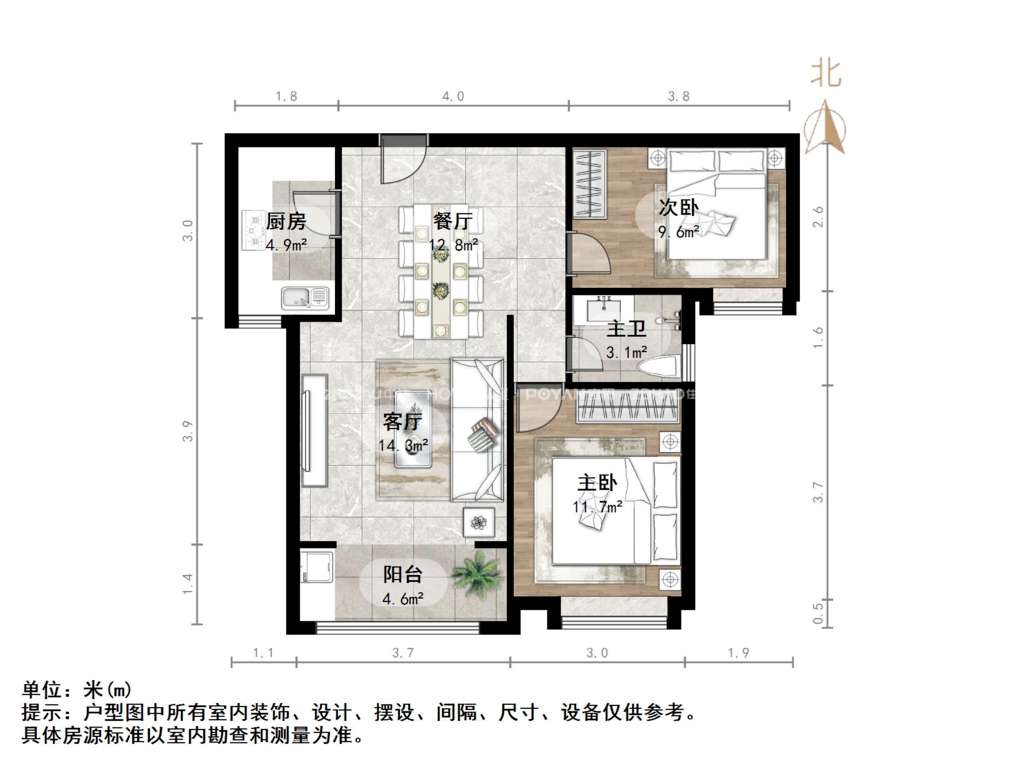 户型:3室2厅1厨1卫1阳台 ,朝向:南北,格局方正,南北通透,使用率超赞