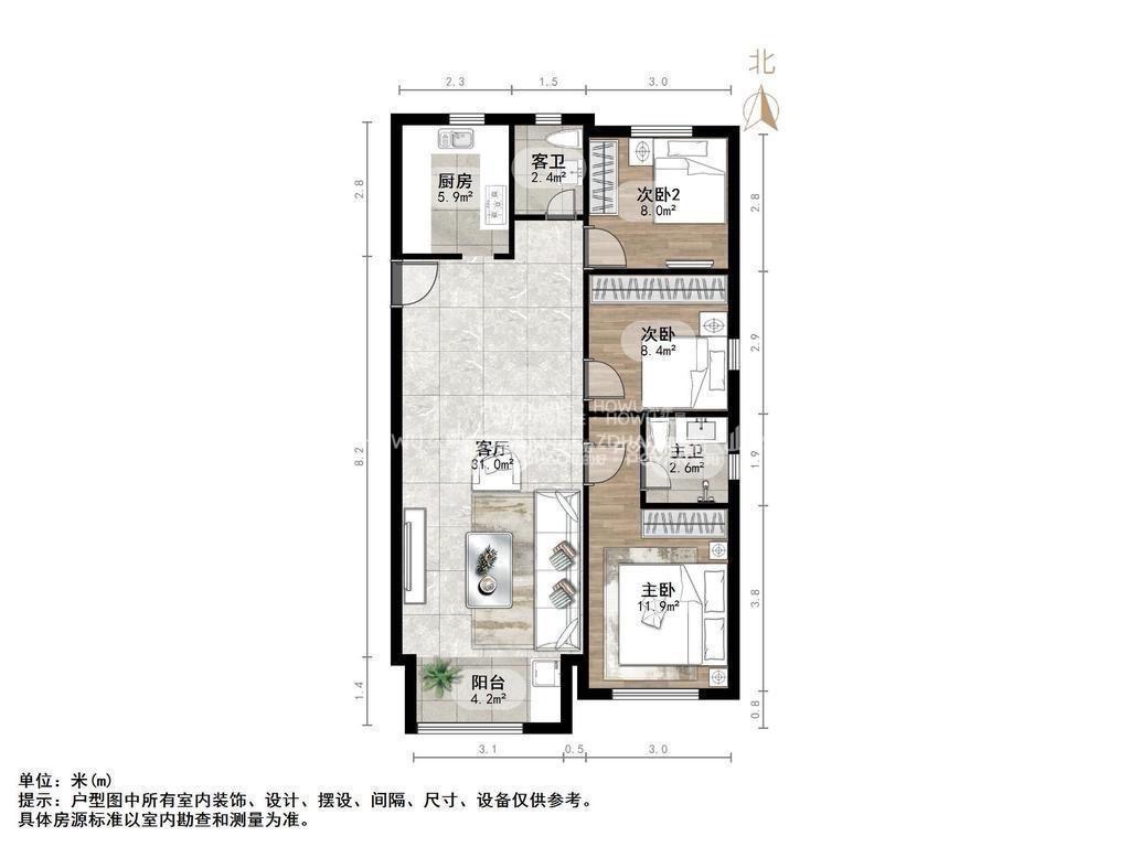 厅室3室2厅2卫1阳台