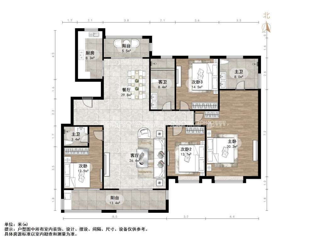 厅室4室2厅3卫2阳台