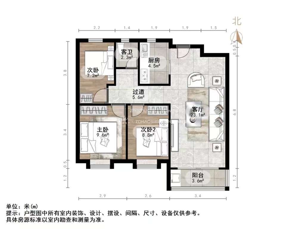 厅室3室2厅2卫1阳台
