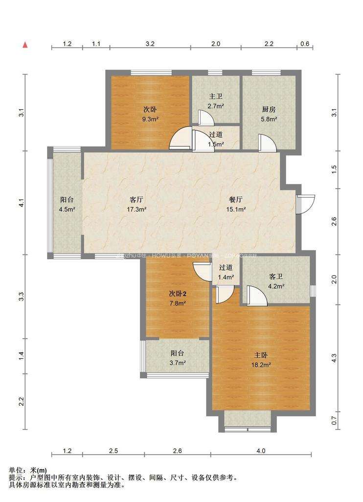 厅室3室2厅2卫1阳台