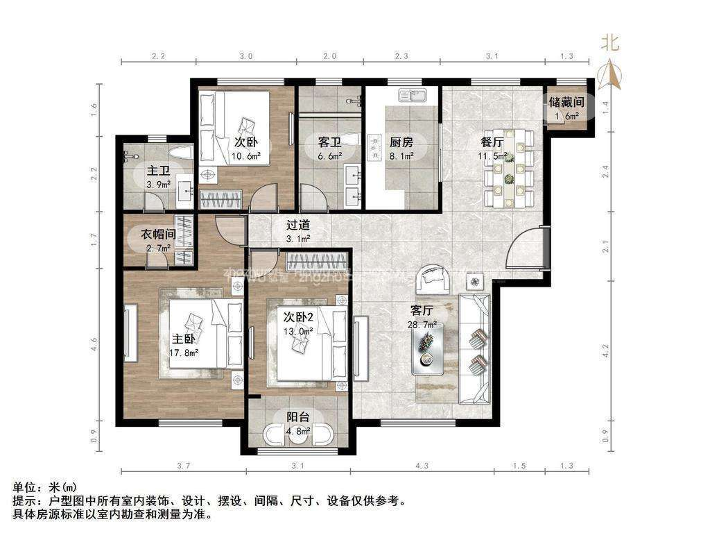 厅室3室2厅2卫1阳台