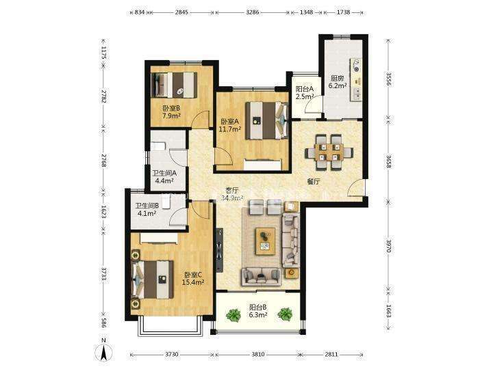 厅室3室2厅2卫1阳台