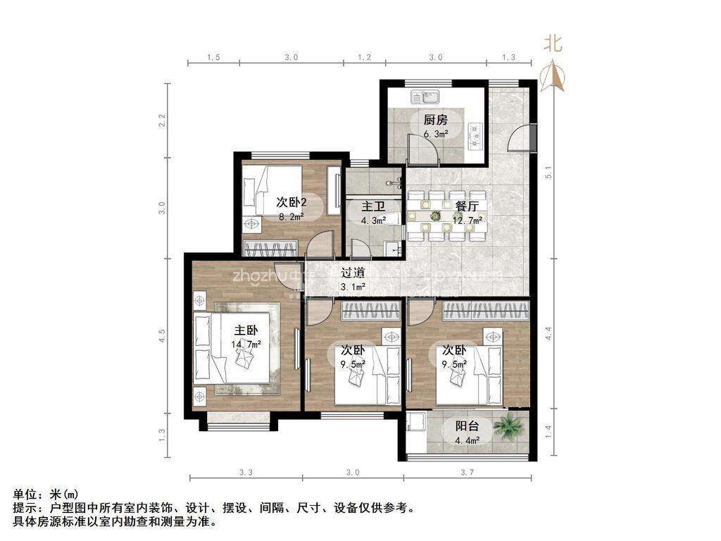 厅室3室2厅1卫1阳台