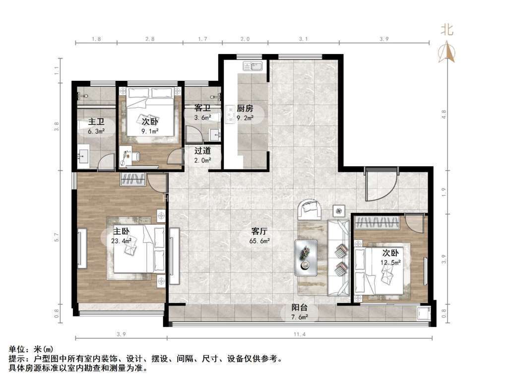 厅室3室2厅2卫1阳台