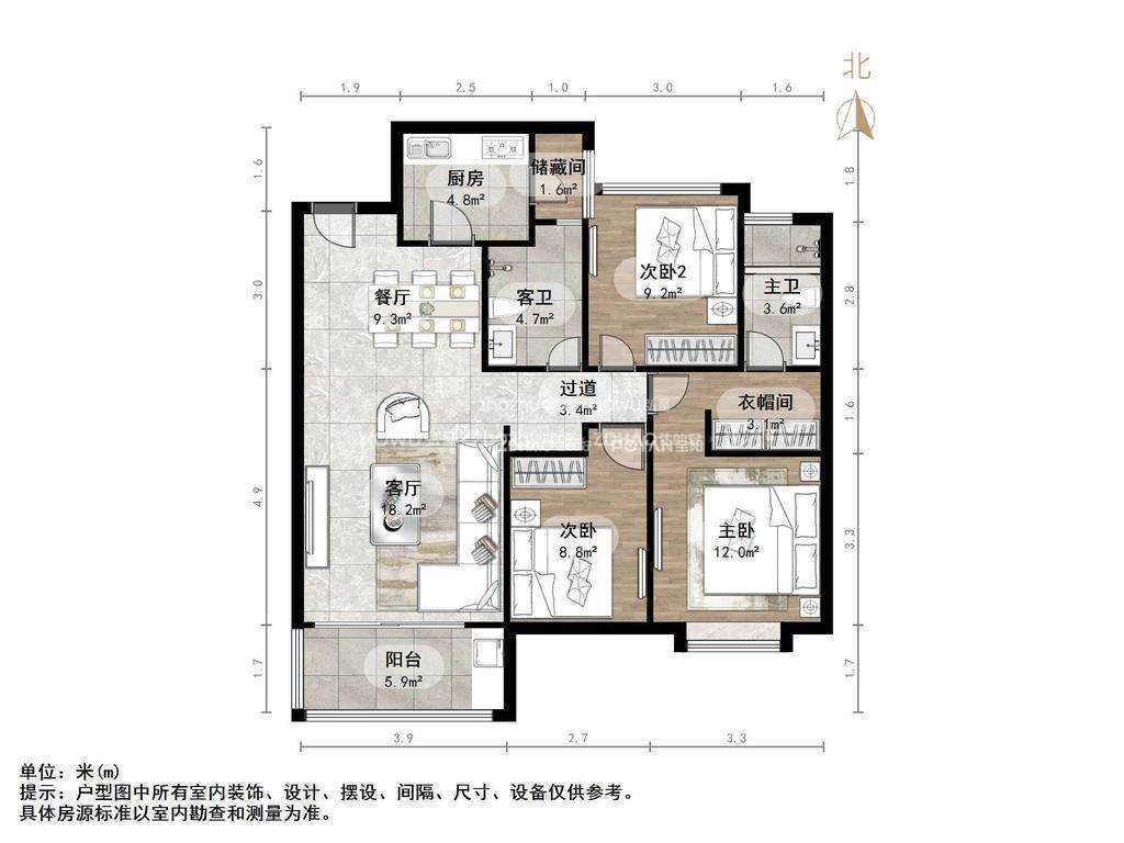 厅室3室2厅2卫1阳台