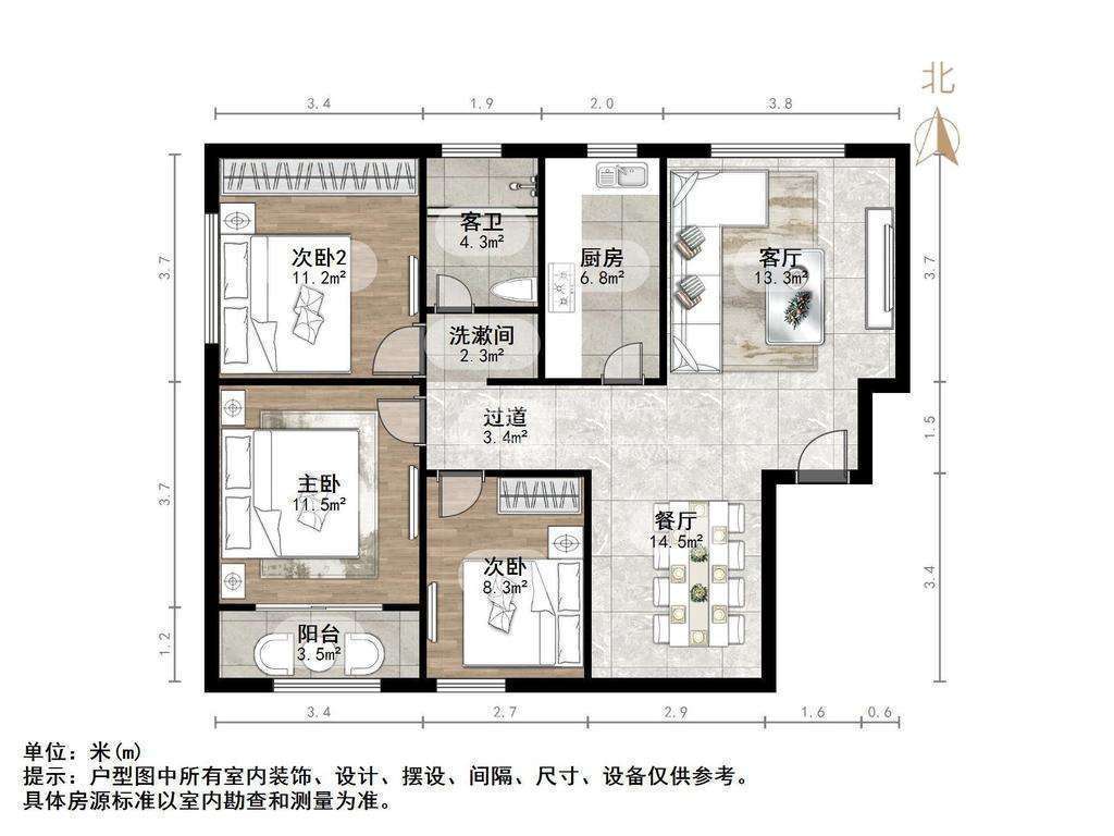 厅室3室2厅1卫1阳台