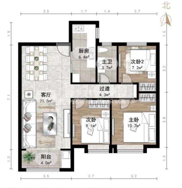 厅室3室2厅1卫1阳台