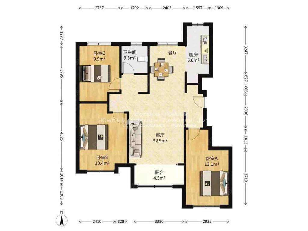 厅室3室2厅1卫1阳台