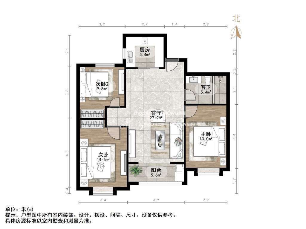 2、户型优势:三室两厅双卫,南北卧室,客厅方正好用,单元对讲门,大院传达,安全性高!