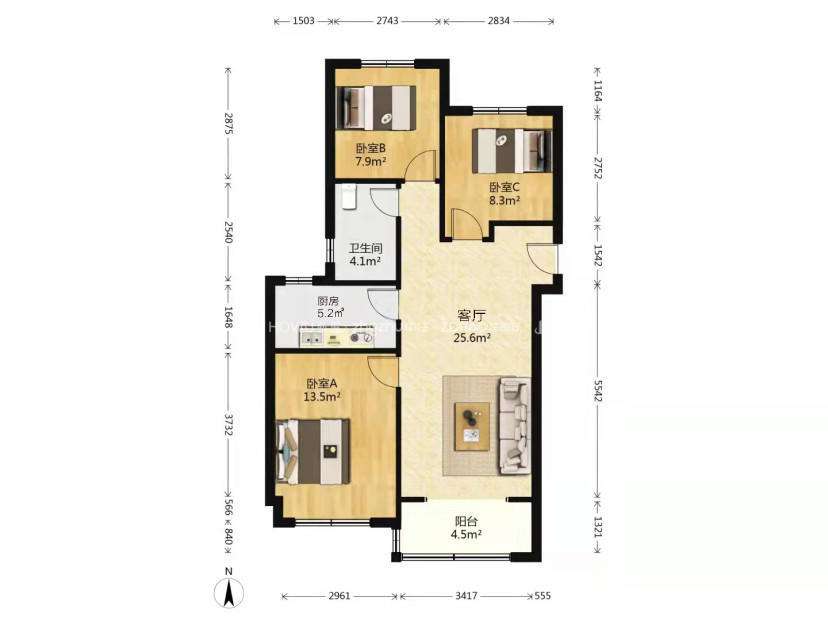 厅室3室2厅1卫1阳台