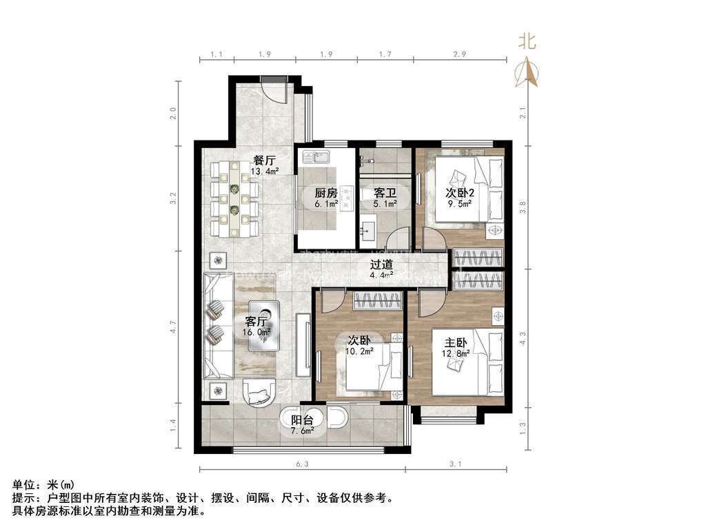 厅室3室2厅1卫1阳台