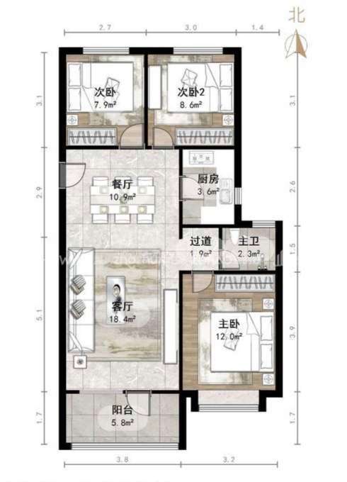 厅室3室2厅1卫1阳台