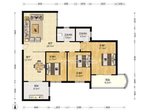 厅室3室2厅2卫1阳台