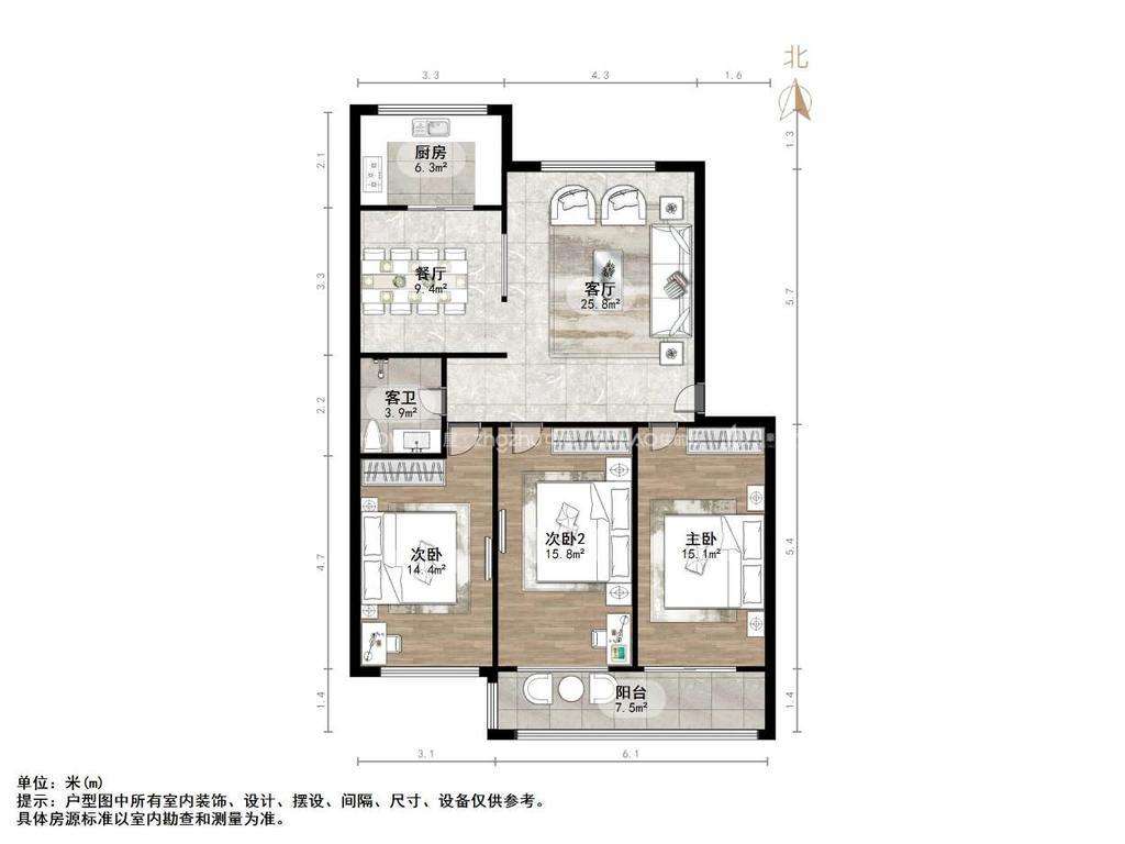 厅室3室2厅1卫1阳台