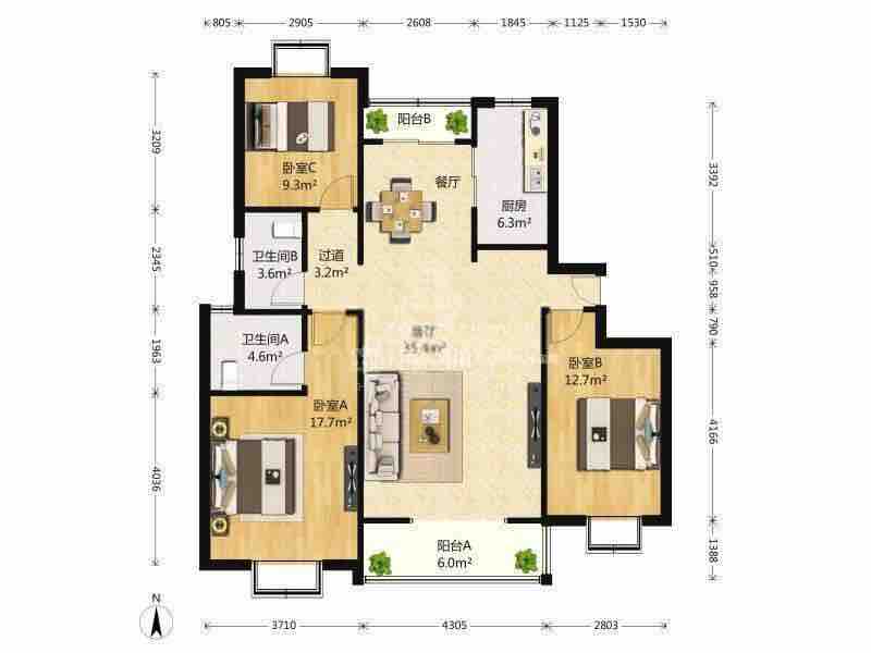 厅室3室2厅2卫1阳台