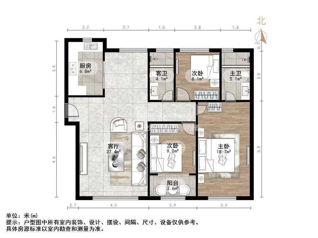 厅室3室2厅2卫1阳台