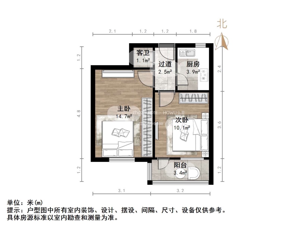 厅室2室1厅1卫1阳台