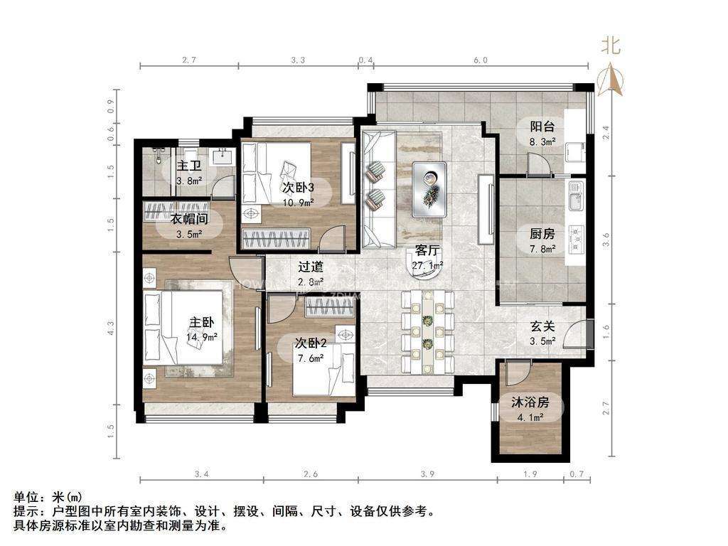 厅室3室2厅2卫1阳台