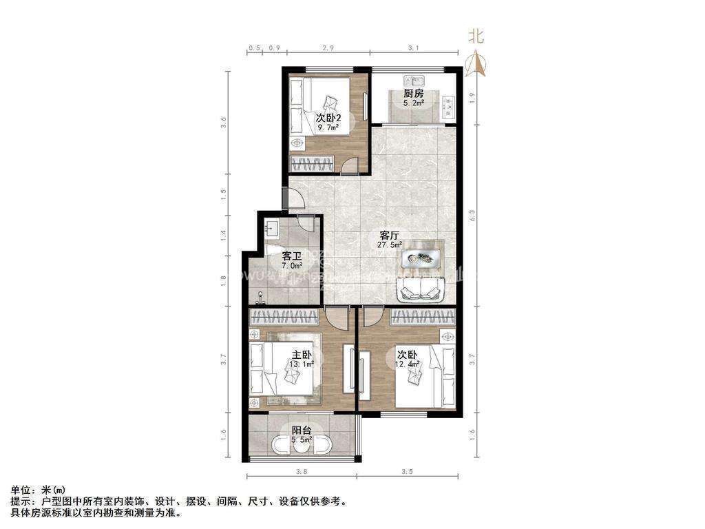厅室3室2厅1卫1阳台