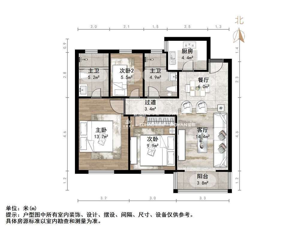 厅室3室2厅2卫1阳台