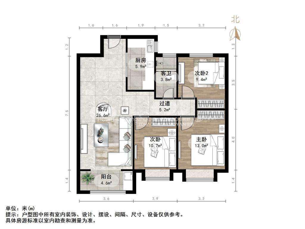 厅室3室2厅1卫1阳台
