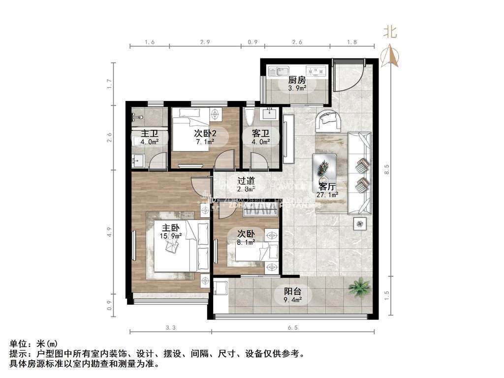 厅室3室2厅2卫1阳台