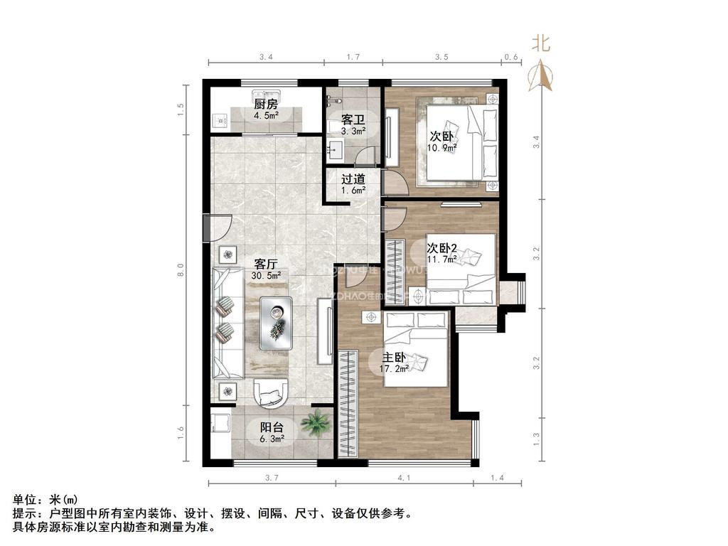 厅室3室2厅1卫1阳台