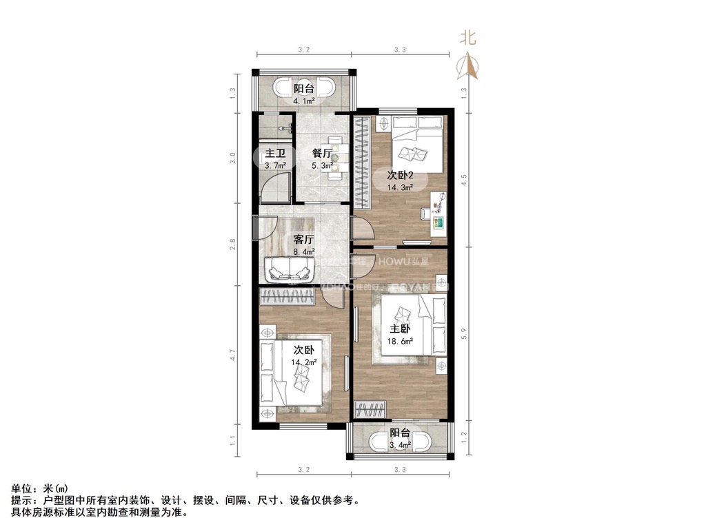 厅室3室1厅1卫2阳台