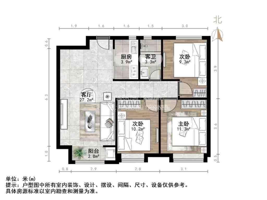 厅室3室2厅1卫1阳台