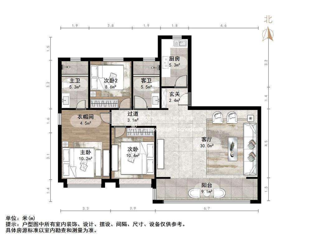 厅室3室2厅2卫1阳台