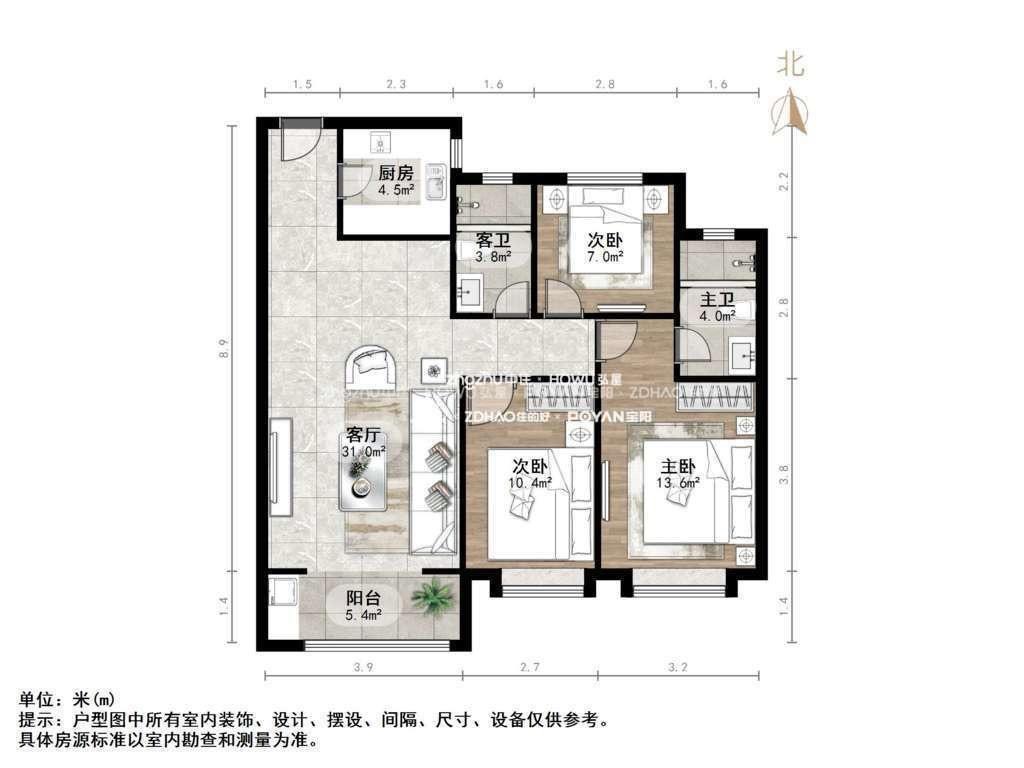 厅室3室2厅2卫1阳台
