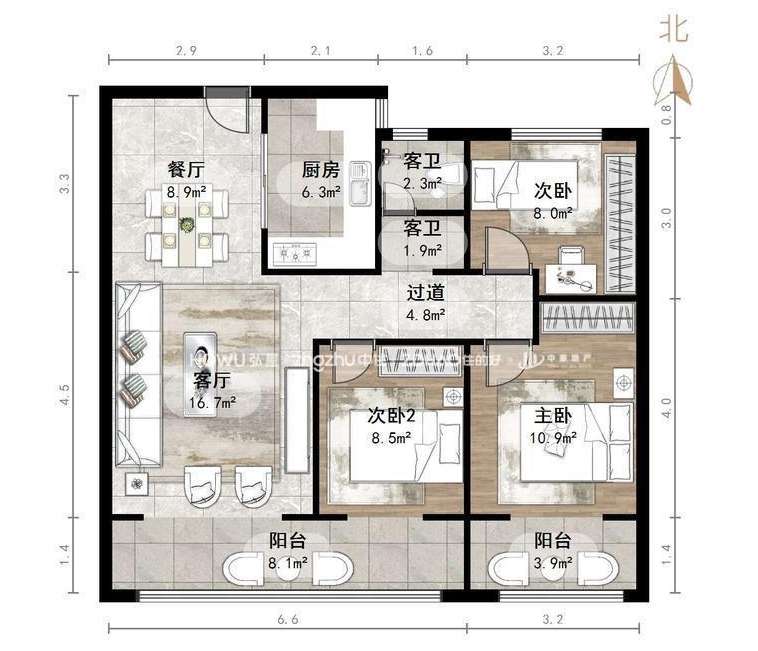厅室3室2厅2卫0阳台