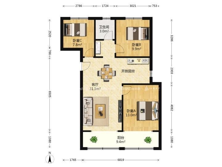 厅室3室2厅1卫1阳台
