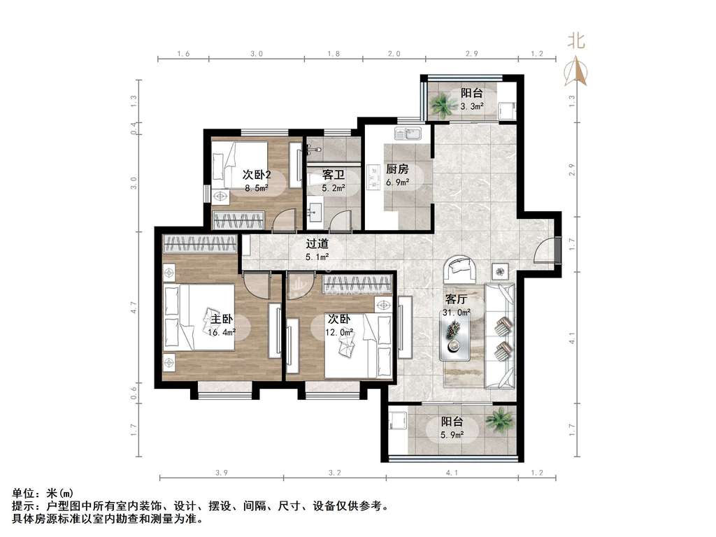 厅室3室2厅1卫1阳台