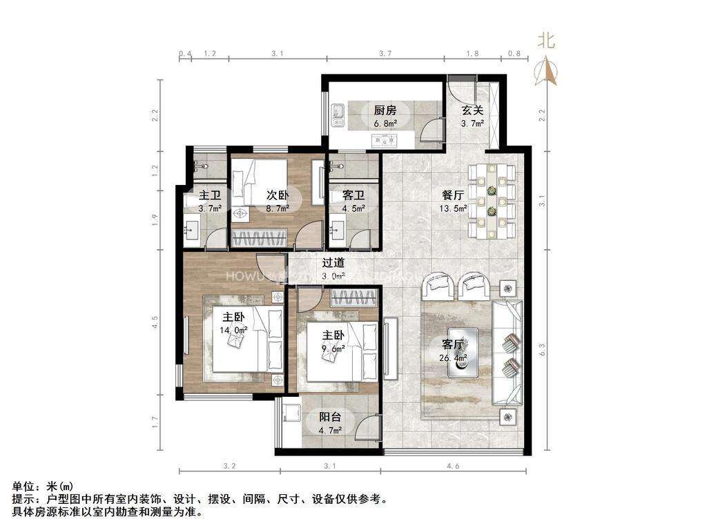 厅室3室2厅2卫1阳台