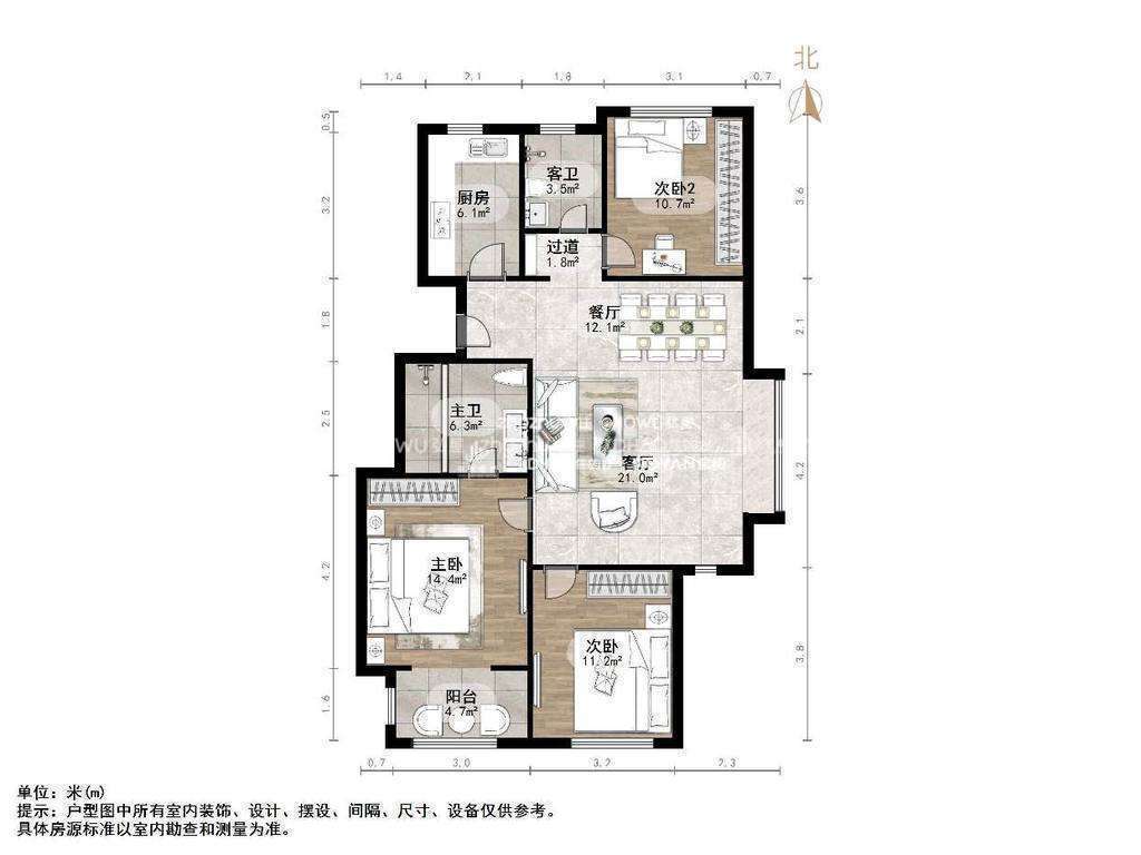 厅室3室2厅2卫1阳台