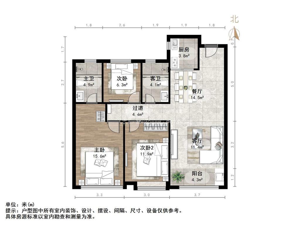 厅室3室2厅2卫1阳台