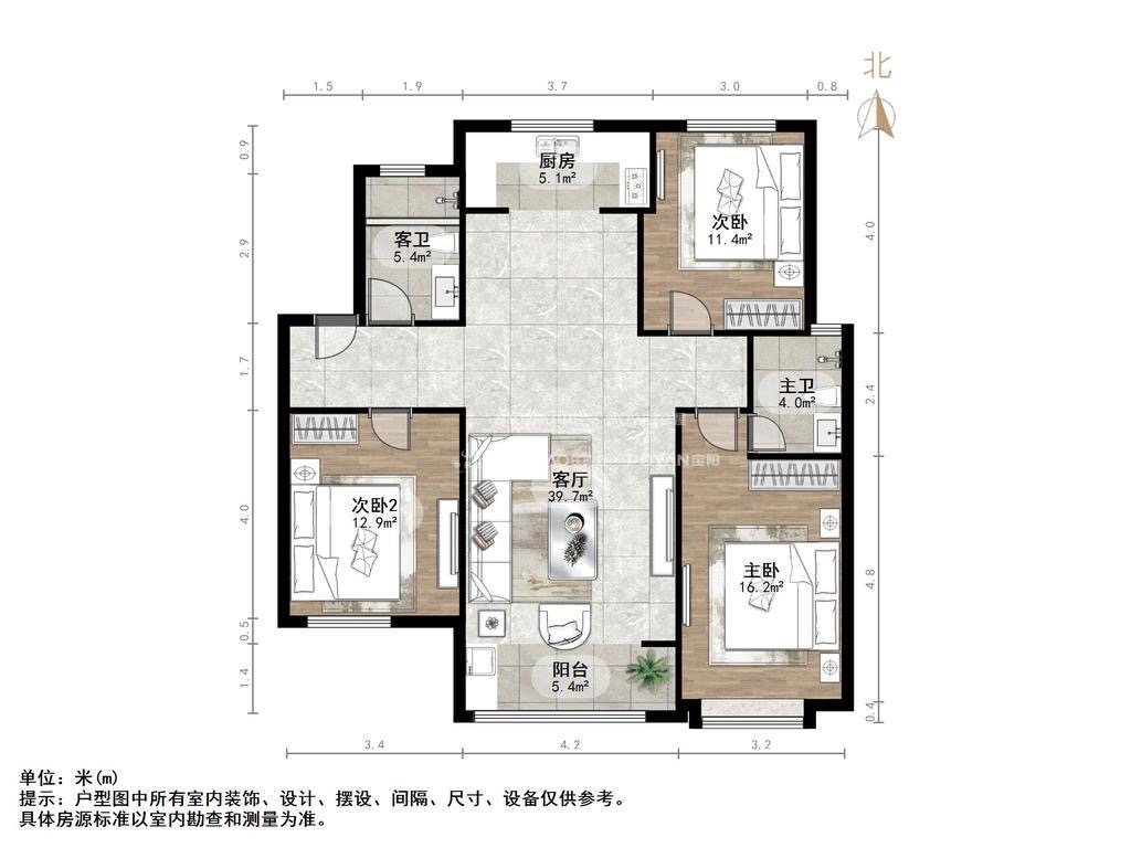 厅室3室2厅2卫1阳台