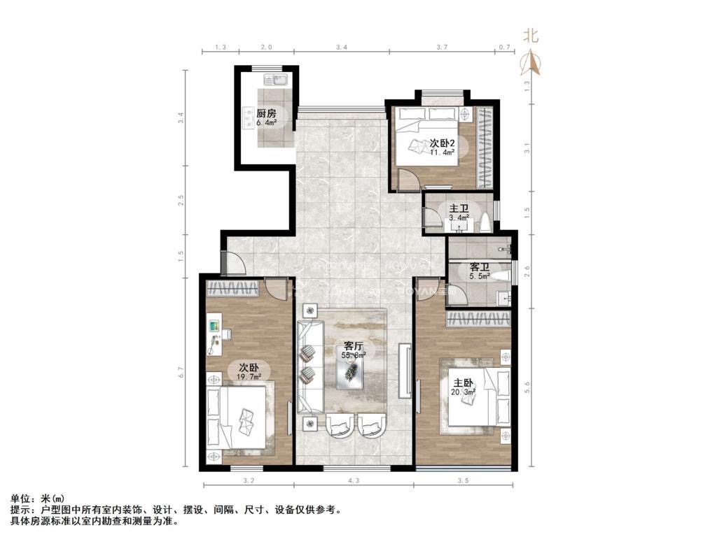 厅室3室2厅2卫1阳台