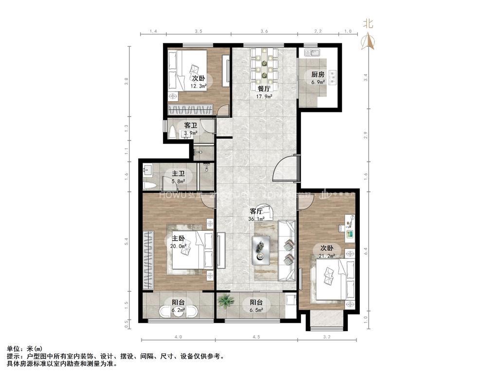 厅室3室2厅2卫1阳台