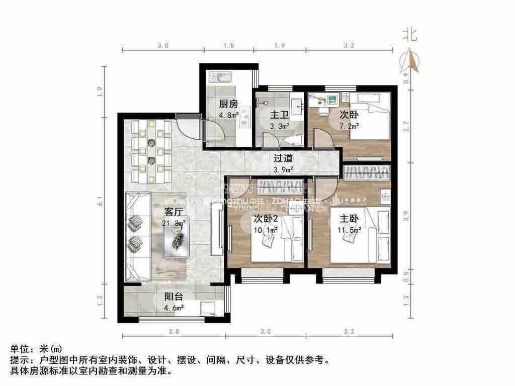 厅室3室2厅1卫1阳台